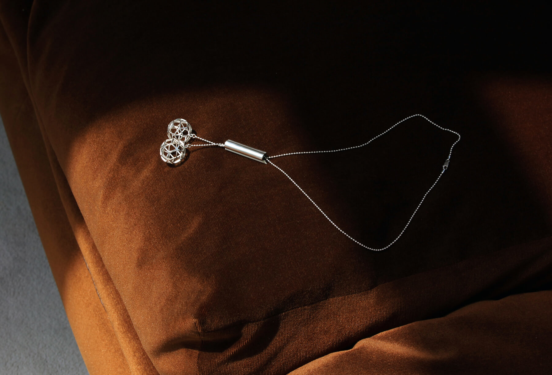 The two spheres can be arranged in different constellations. In the light, the lattice structure of the pendant throws delicate shadow patterns on the skin and clothing. This interplay of light and shadow was captured in an exclusive shoot in Villa Beer in Vienna by the internationally renowned fashion photographer Michael Dürr.